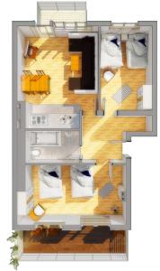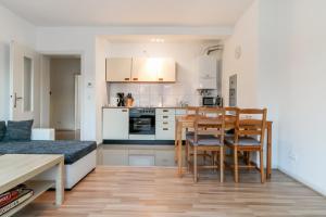Uvnitř apartmánu jsou k dispozici dvě ložnice a jedna koupelna vybavená vanou a fénem. Obývací část nabízí posezení včetně pohovky a žehličku pro větší komfort. Plně vybavená kuchyně zahrnuje varnou desku, troubu, lednici, mikrovlnnou troubu, kávovar, toustovač, rychlovarnou konvici, jídelní stůl s dětskou židličkou, kuchyňský kout i kompletní kuchyňské nádobí.